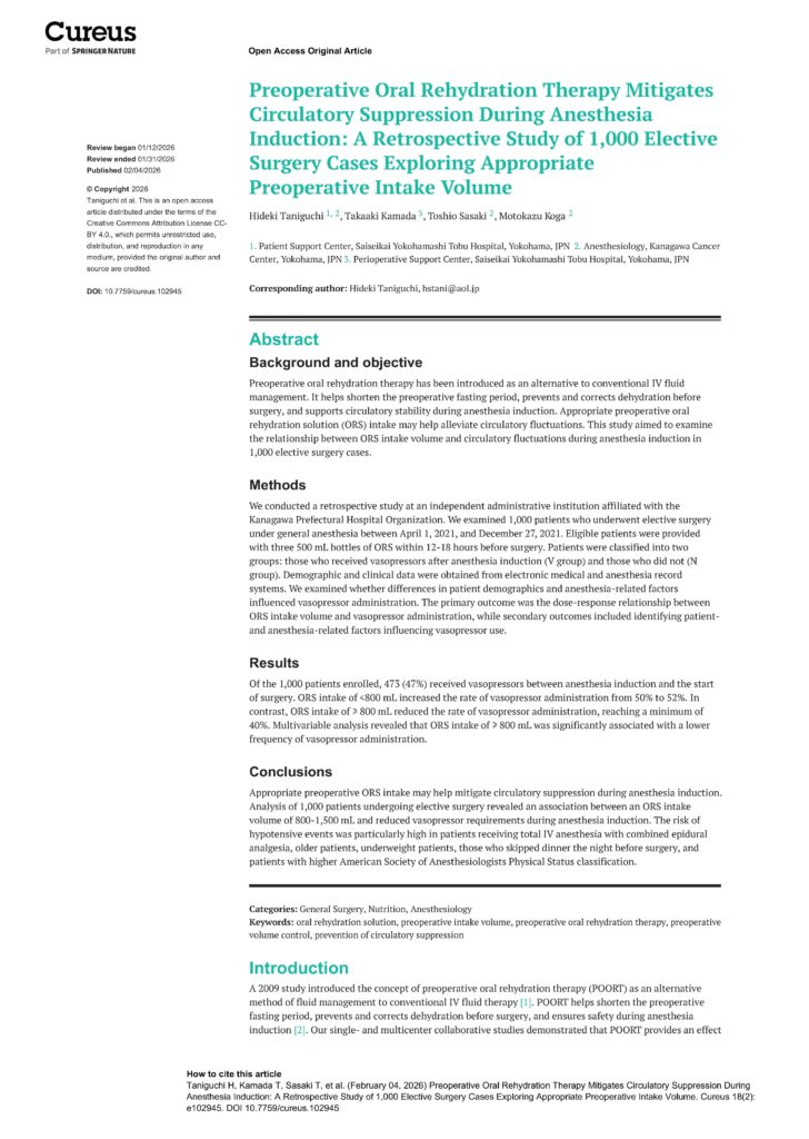 谷口先生の論文がアクセプトされました! 2026 2/06 お知らせ 2026年2月6日 谷口英喜先生の論文がアクセプトされました。「術前に経口補水液を800ml以上飲むと、麻酔導入時の低血圧を防げる」という主旨の論文です。 こちらの論文は、ダウンロードが可能ですので、ご興味のある方はアクセスしてみてください。 ダウンロード お知らせ 11.臨床研究事前登録を学ぶ【臨床研究・論文作成・発表】 関連記事 アンケートに答えて「谷口ゼミ」特製缶バッジを手に入れよう!(会員限定) 2026年1月17日 外部講演会のお知らせ(2月) 2026年1月17日 谷口先生、テレビ出演のお知らせ(1月8日) 2026年1月6日 外部講演会のお知らせ(12月) 2025年12月2日 谷口先生の論文がアクセプトされ、公開となりました! 2025年11月5日 外部講演会のお知らせ(11月) 2025年10月1日 外部講演会のお知らせ(10月) 2025年10月1日 谷口先生、ラジオ出演のお知らせ(10月) 2025年9月28日